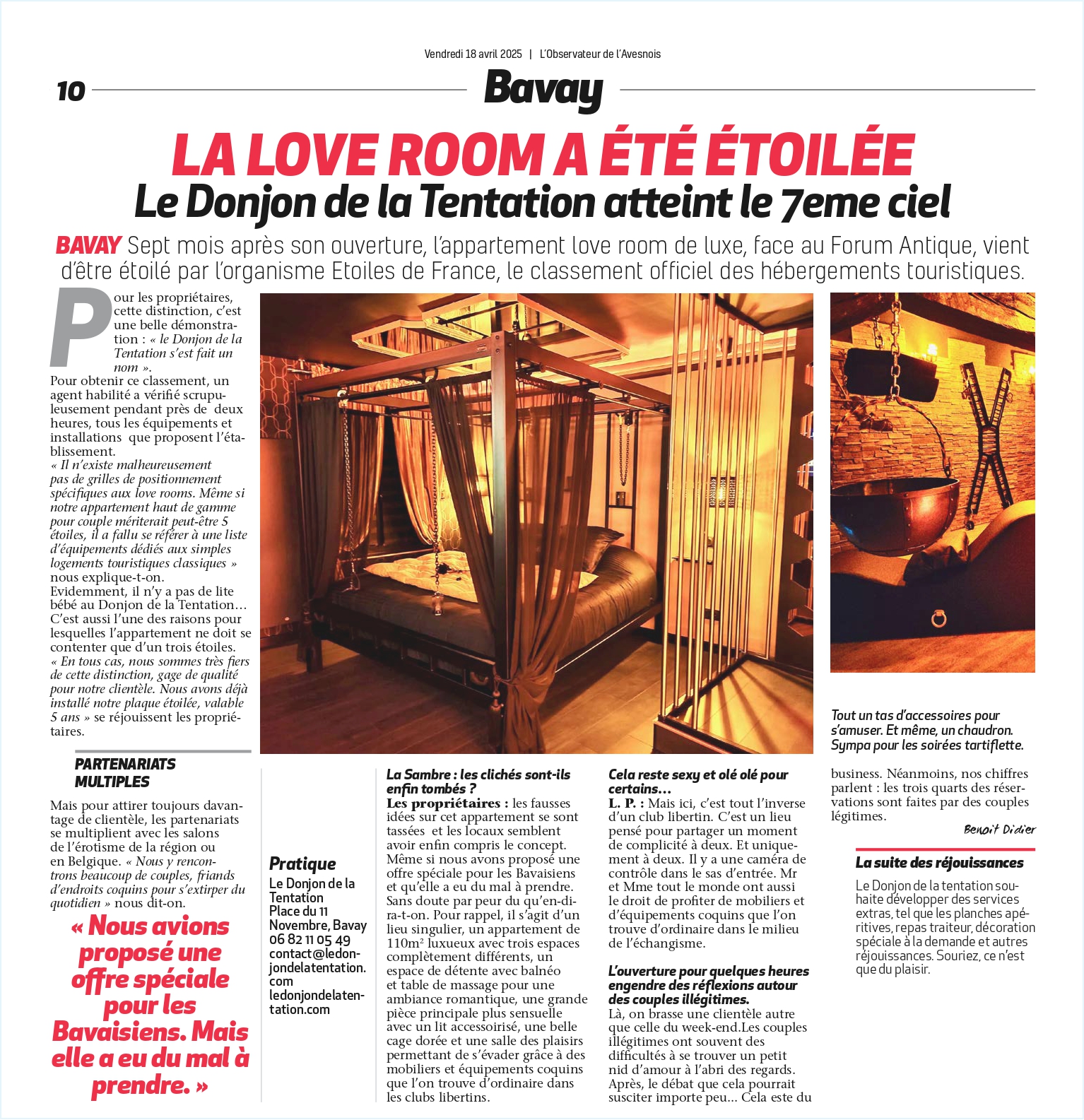 Découvrez ce que la presse dit du Donjon de la Tentation ! Consultez les articles, interviews et reportages qui explorent l’univers captivant de notre appartement Love Room.